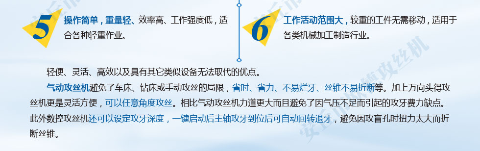 電動攻絲機適用于所有機械制造行業,機床、模具機械、塑膠機械、印刷機械、包裝機械制造廠、工程機械、汽車摩托車零部件、航空發動機、機車車輛、煙草機械以及通用機械等行業。